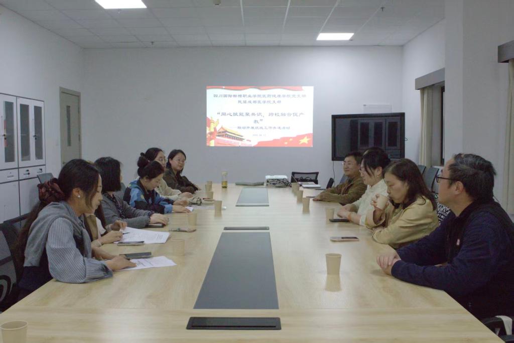2026年4月10日,民盟成都医学院支部联合川音美术学院工业设计党支部,一行前往四川国际标榜职业技术学院参观访问。在医药健康学院,举办了“同心赋能聚共识,跨校融合促产教”的统战座谈会议。共同学习了习近平总书记关于“为人民出政绩 以实干出政绩”的思想理论,随后川音美院工业设计党支部和标榜统战部介绍了本单位建设概况和统战工作的基本情况,成都医学院支部主委程曦介绍了成都医学院检验医学院基本情况,以及支部参政议政、社会服务和组织建设的情况,三方还以此次活动为契机,探讨了后续在科研合作、产教融合、定期互访等方面的交流共建方案。